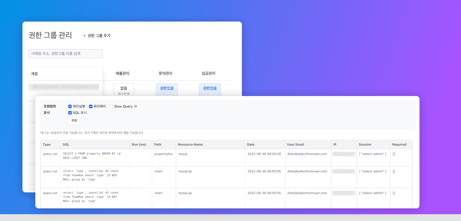 관리자만 사용자 접근로그, 메뉴, IP, 쿼리, 세션 권한을 조회가능하며