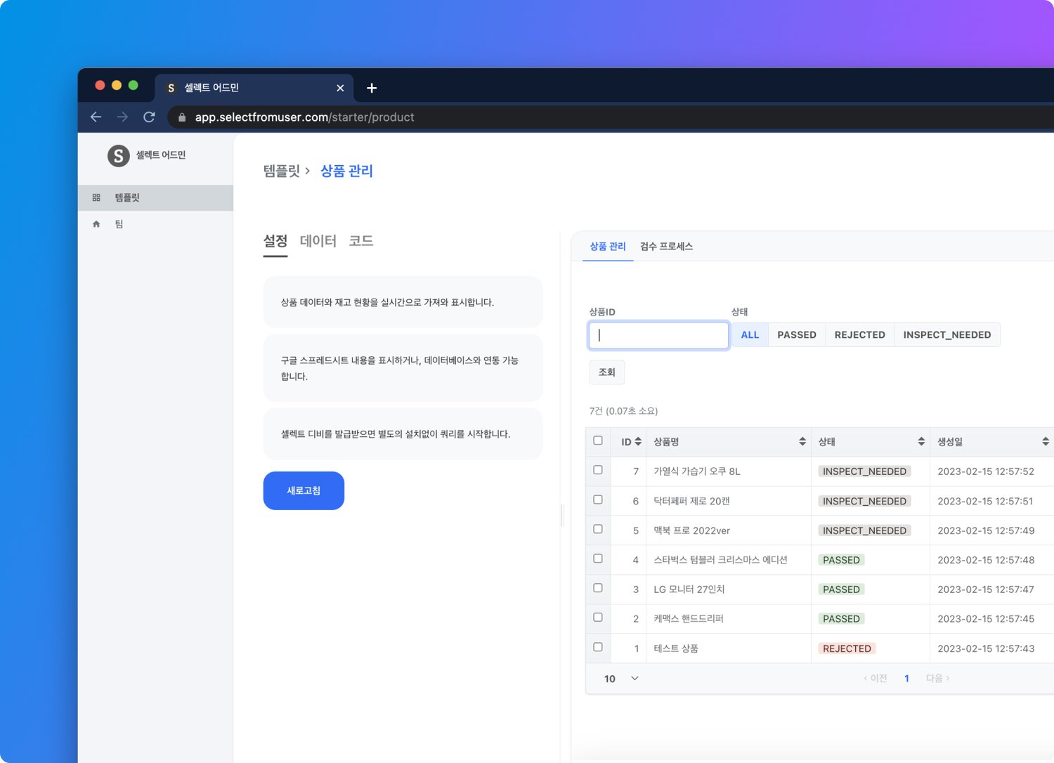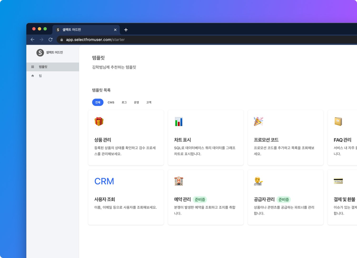 셀렉트는 어드민을 만들 때의 시간과 리소스를 줄이는데 집중하고 있어요. 특히 어드민은 처음에 구상하는 시간이 많이 소요됩니다. 고객분들의 이런 시간을 아끼실 수 있게 상황별 템플릿을 추가하고 있습니다.