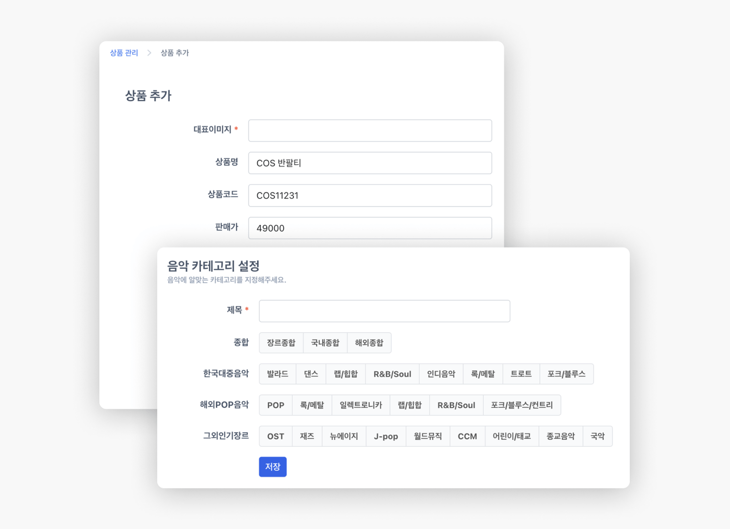 상품 추가나 카테고리 설정 등 다양한 입력 페이지를 만들고 이용해보세요.